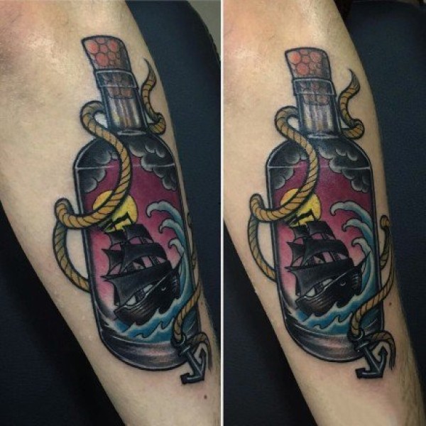 漂流瓶纹身 男生手臂上彩色的瓶子纹身图片