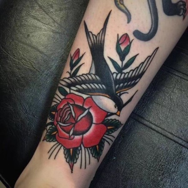 彩色玫瑰花燕子纹身手稿图片