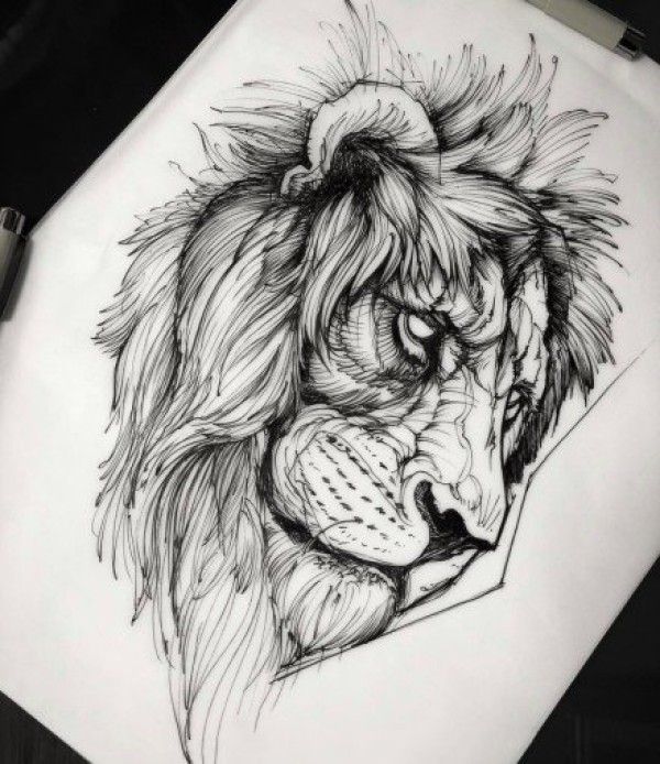 纹身狮子头手稿 简单线条纹身素描黑色纹身狮子头手稿