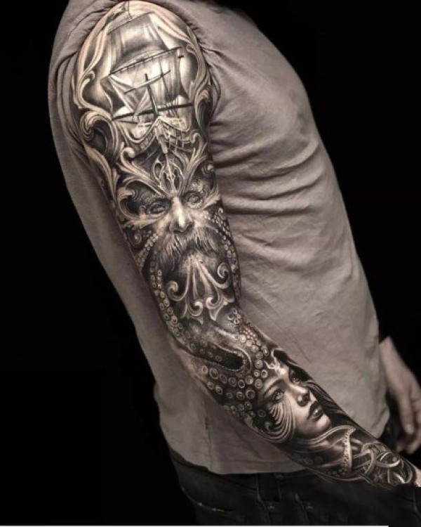 花臂:一组老传统风格的大花臂纹身图片