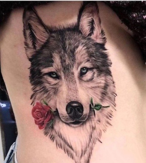 女性下腹部玫瑰花和大狼纹身图片