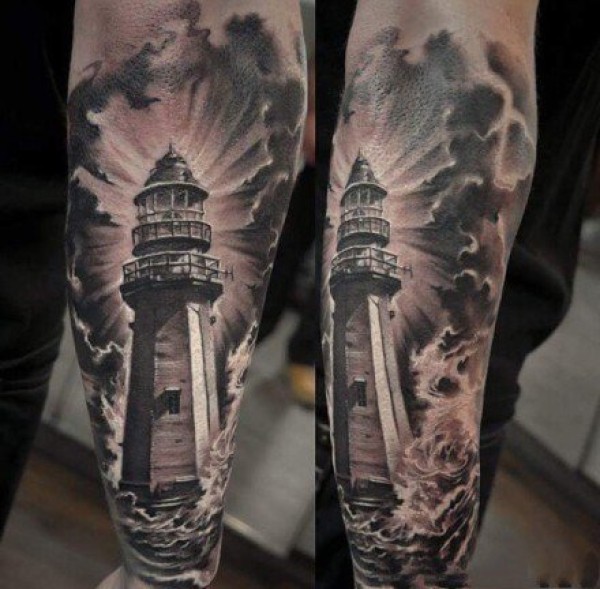 大臂纹身图 男生大臂上齿轮和灯塔纹身图片