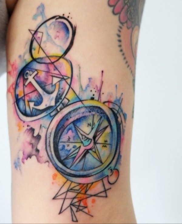 纹身指南针 水彩与线条结合的指南针纹身图案