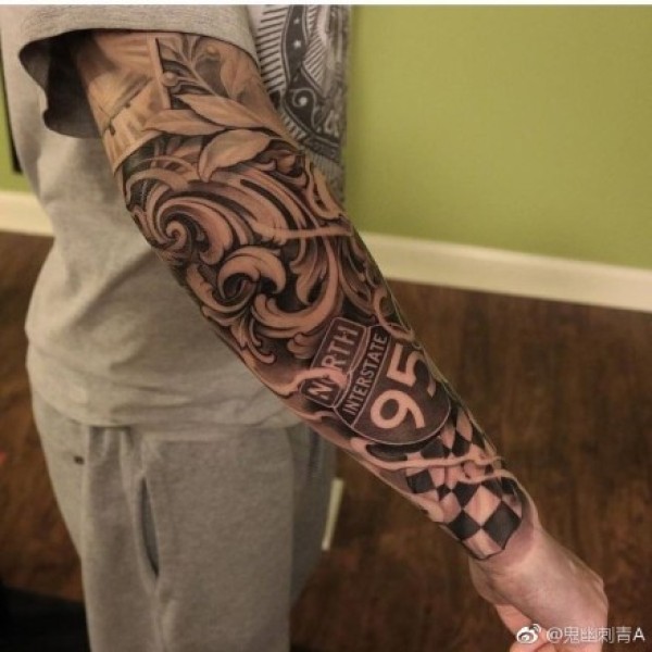 欧美花臂纹身_22张霸气黑灰欧美大黑花臂纹身图案作品图片