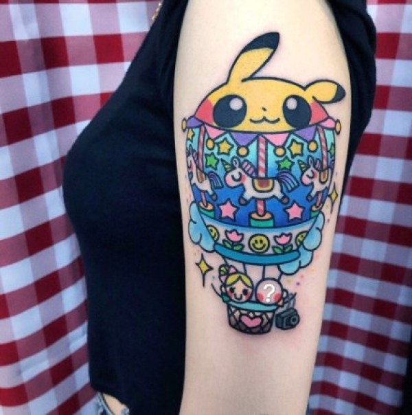 手臂纹身图片 男生手臂上人物和热气球纹身图片