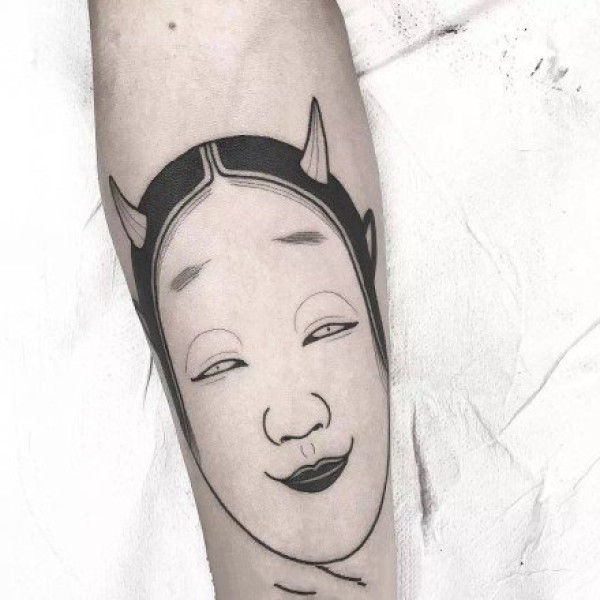 日式面具的暗黑线条简约纹身作品