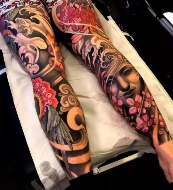 传统风格的一组男性花臂和花腿纹身图案欣赏