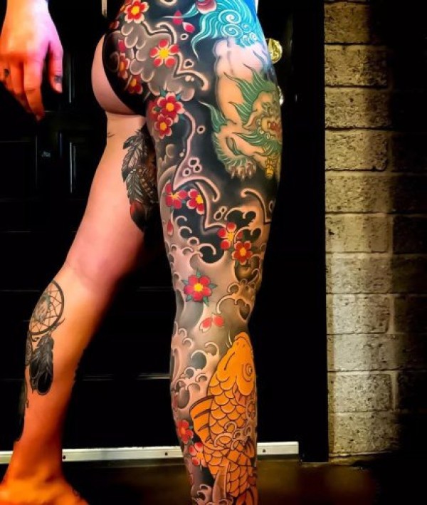 传统花腿纹身--18张传统风格的大花腿纹身图案作品