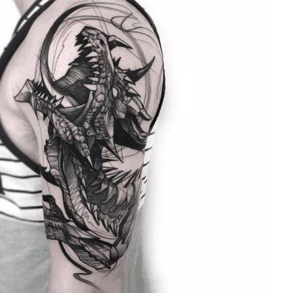 龙纹身手稿_一组老传统黑灰龙手稿纹身图案