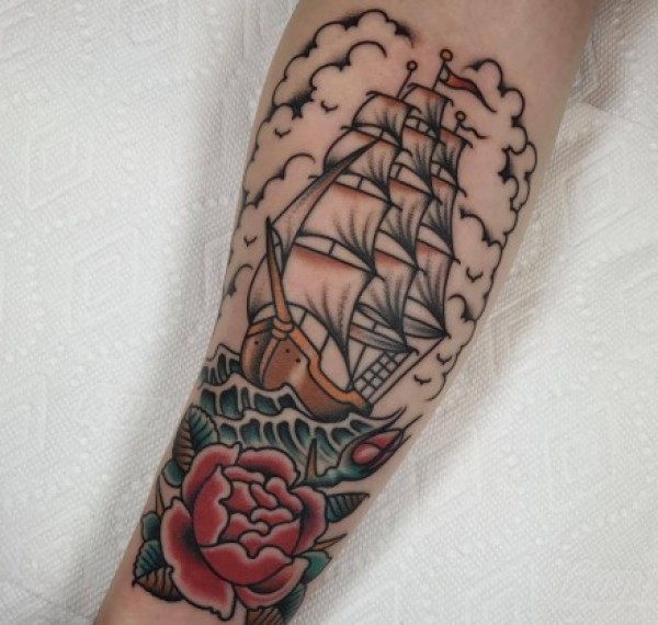 school欧美手帆船海浪玫瑰纹身图案手稿