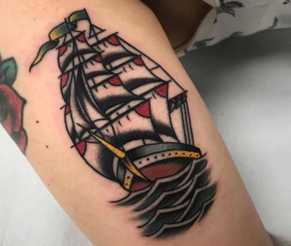大臂纹身图 男生大臂上阴森的海盗船纹身图片
