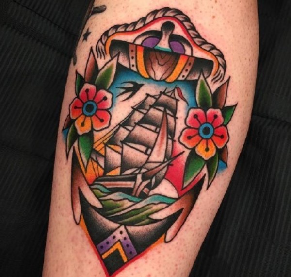 欧美school女郎玫瑰花帆船纹身图案手稿