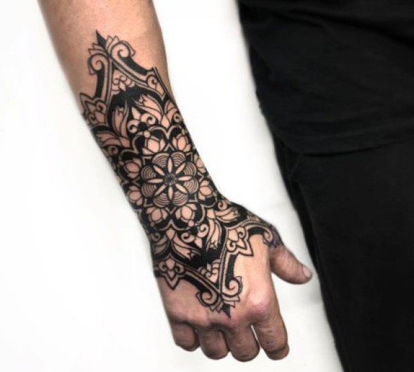 手背到小臂上的黑色点刺梵花纹身图案9张