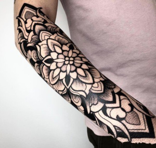 手背到小臂上的黑色点刺梵花纹身图案9张