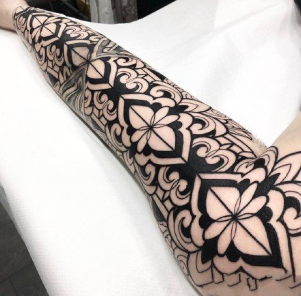 手背到小臂上的黑色点刺梵花纹身图案9张