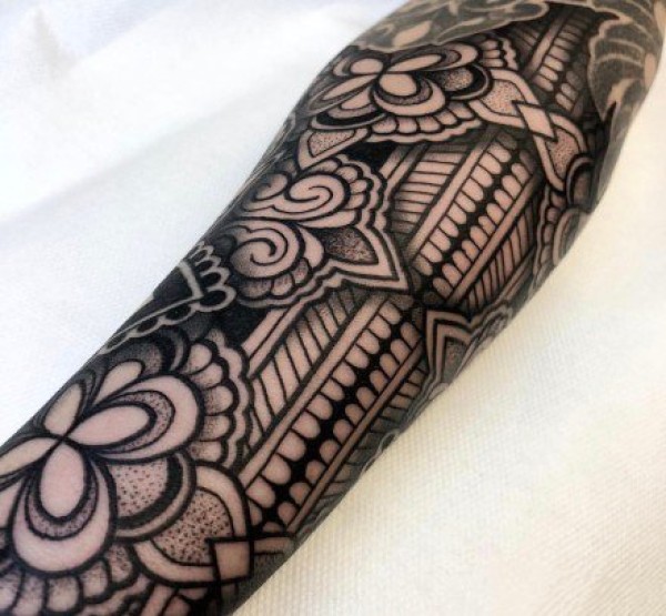 手背到小臂上的黑色点刺梵花纹身图案9张