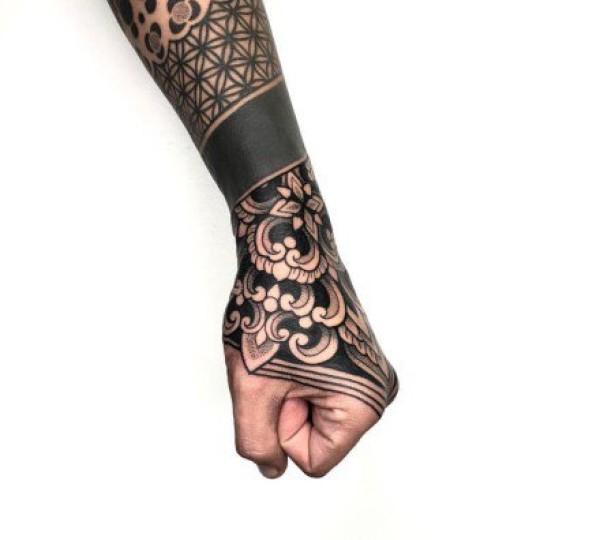 手背到小臂上的黑色点刺梵花纹身图案9张
