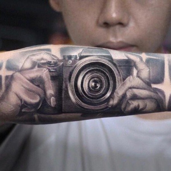 手指上纹身小图案 女生手臂上黑灰色的相机纹身图片