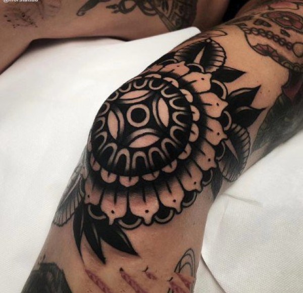 膝盖上的黑色点刺梵花图腾纹身作品图案