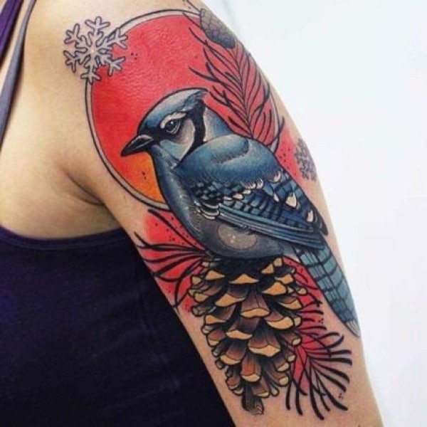 彩色newschool风格的喜鹊等花鸟纹身图案