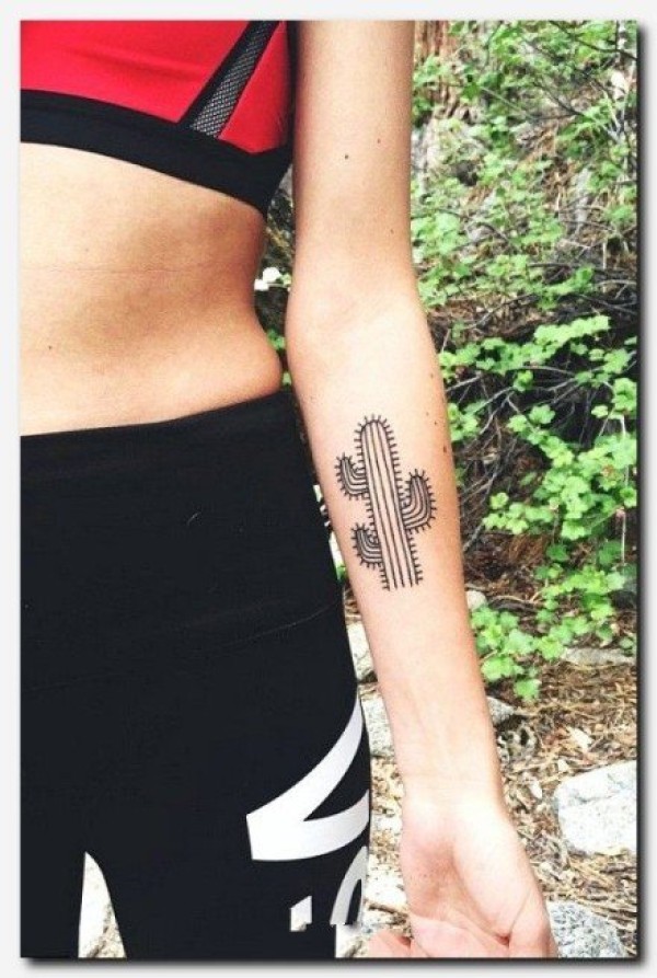 女生大臂上彩绘渐变简单线条小清新植物仙人掌纹身图片