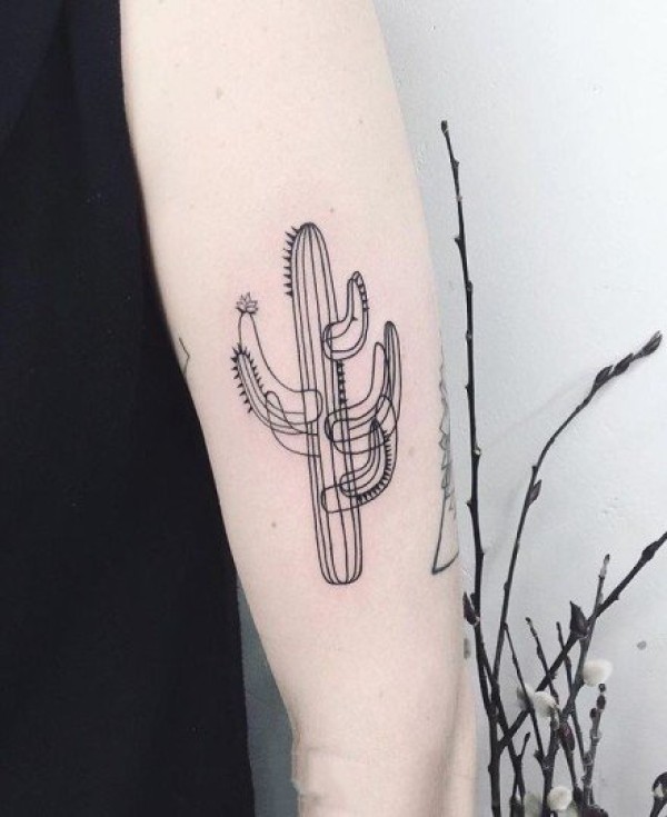 女生大臂上彩绘渐变简单线条小清新植物仙人掌纹身图片