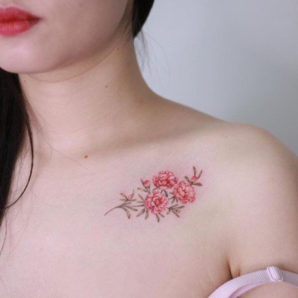 女生锁骨下的唯美花朵纹身图案