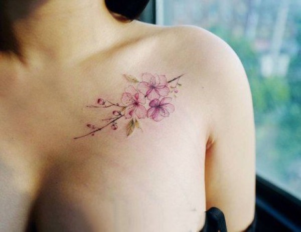 女生肩部锁骨的小清新水彩花朵纹身图案