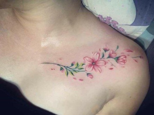 女生锁骨下的唯美花朵纹身图案