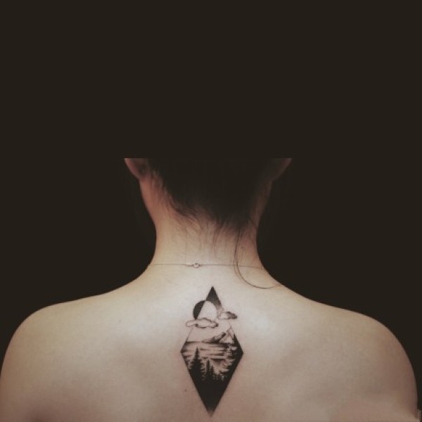 几何元素纹身 男生手臂上菱形和山水风景纹身图片