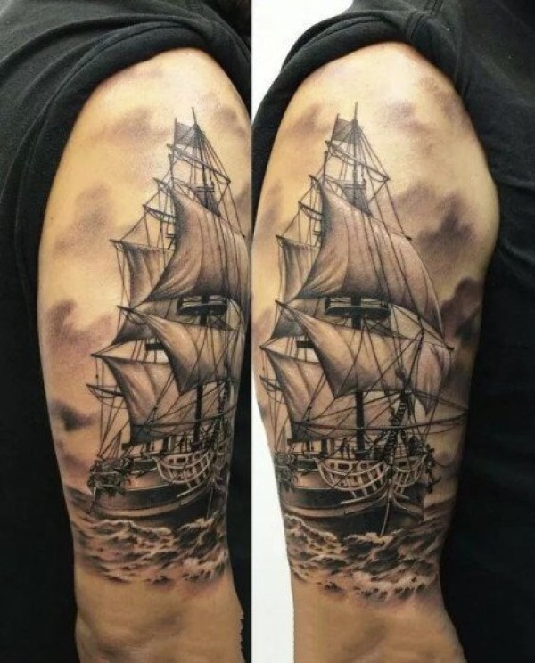 大臂纹身图 男生大臂上阴森的海盗船纹身图片