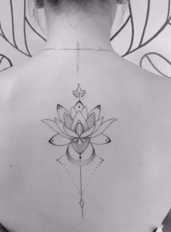 纹身后背女 女生脊柱上梵文和莲花纹身图片
