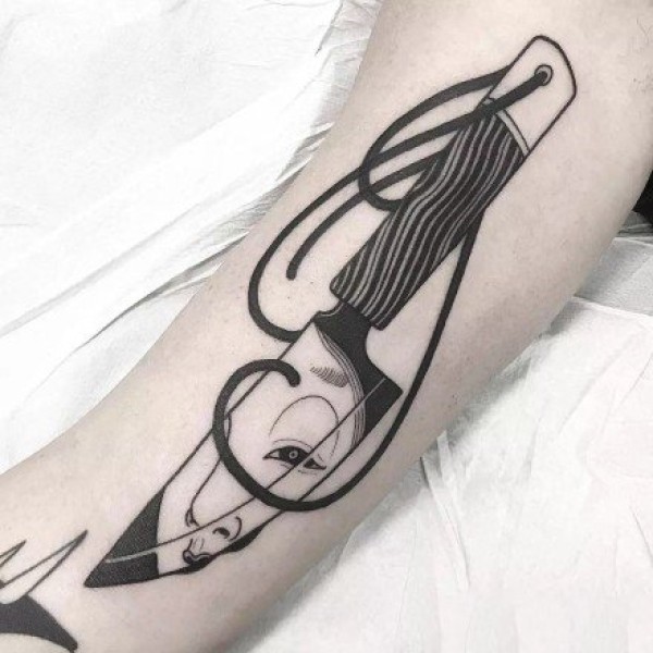 纹在手臂上的黑灰冷兵器匕首纹身图