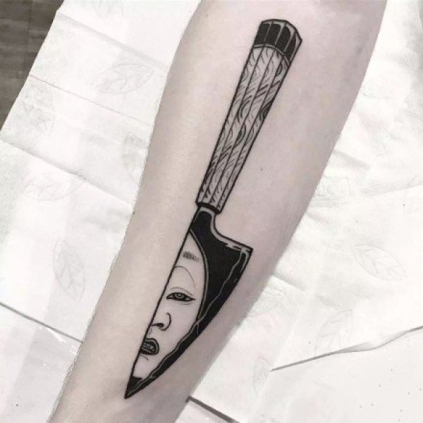 纹在手臂上的黑灰冷兵器匕首纹身图