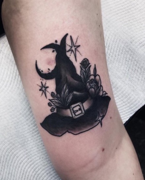 魔法主题的一组魔法扫帚帽子等纹身图案