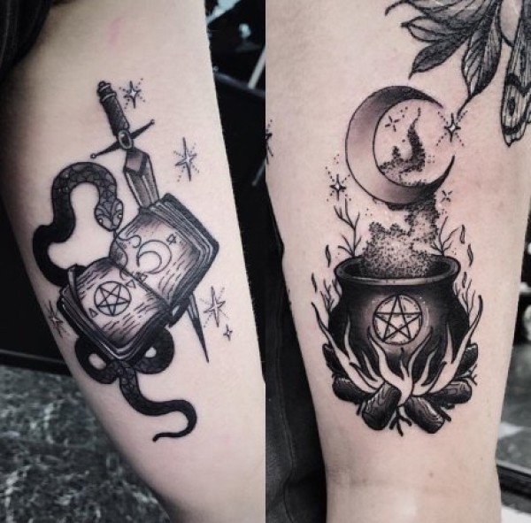 魔杖等魔法主题的黑灰school风格纹身图片