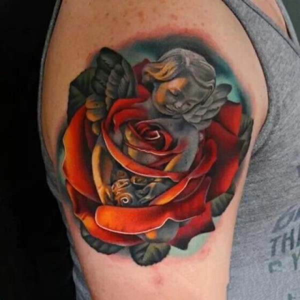 复古骷髅玫瑰肩部纹身_玫瑰花纹身图案大全_纹身图吧