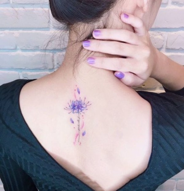 背部紫色花朵纹身