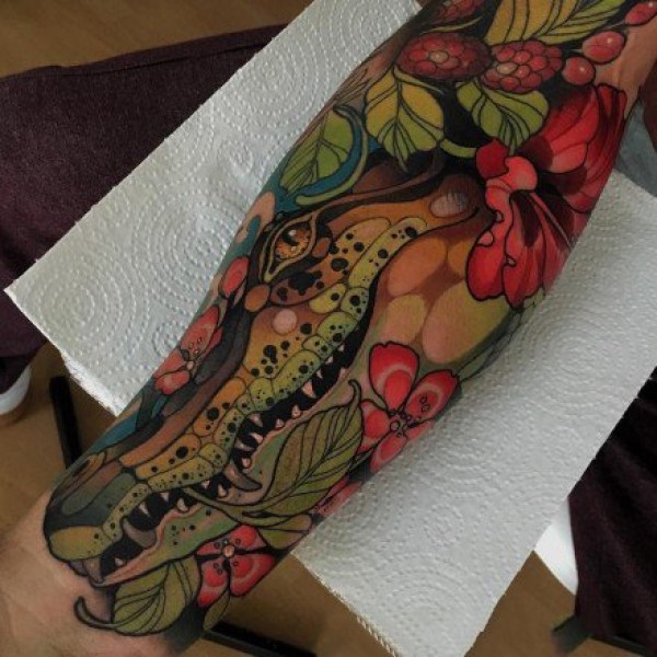 百乐动物纹身 男生手臂上树叶和鳄鱼纹身图片
