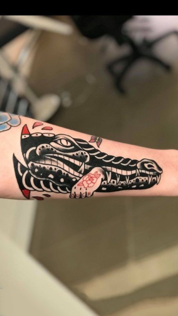 百乐动物纹身 男生手臂上树叶和鳄鱼纹身图片