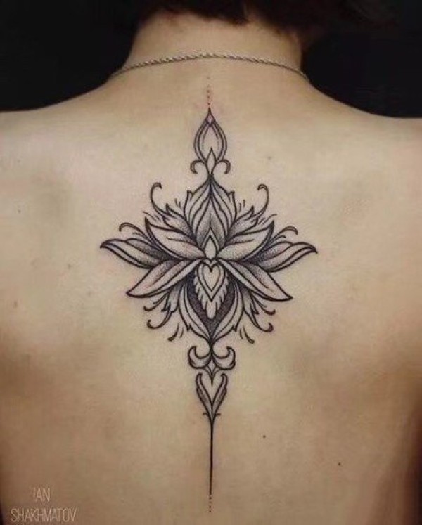 女生后背脊椎处唯美的莲花梵花纹身图案