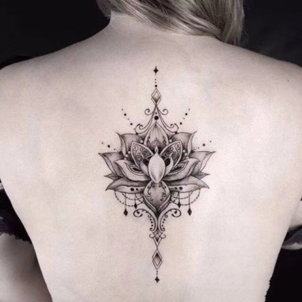 女生后背脊椎处唯美的莲花梵花纹身图案