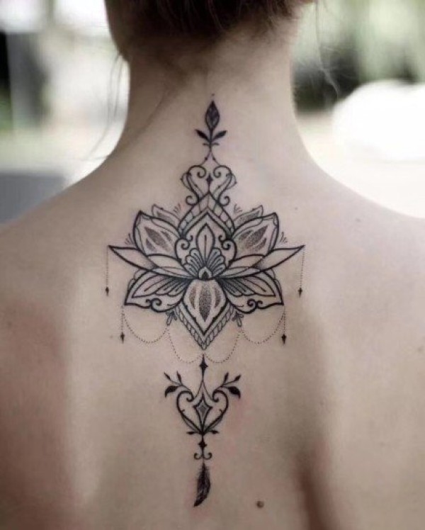 纹身后背女 女生脊柱上梵文和莲花纹身图片