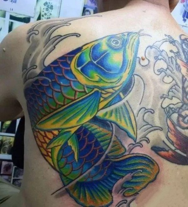 腿部赤红褐色美丽帅气龙鱼纹身图案