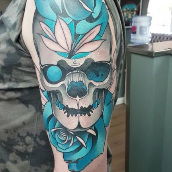 女生手臂经典潮流的骷髅与玫瑰花纹身图案