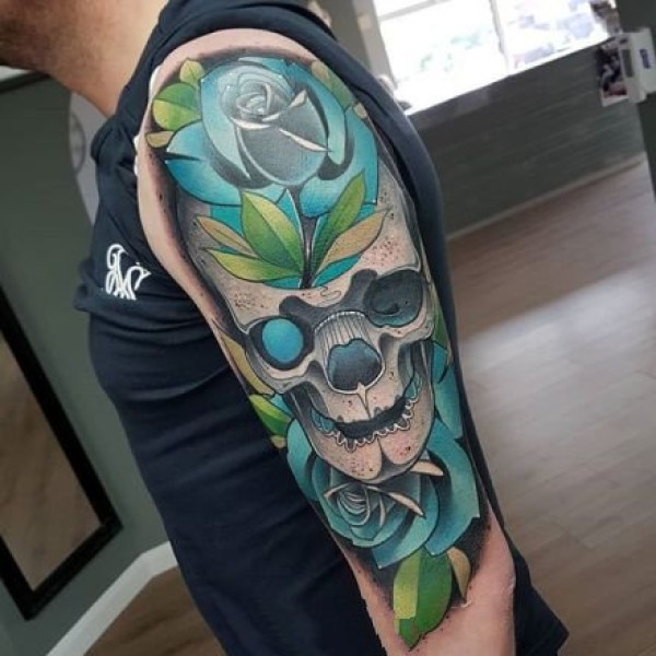 女生手臂经典潮流的骷髅与玫瑰花纹身图案