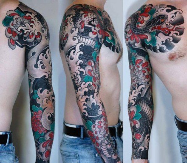 传统风格的一组男性花臂和花腿纹身图案欣赏