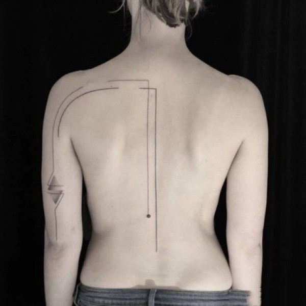 女生背部脊椎处漂亮的黑灰点刺纹身图案欣赏