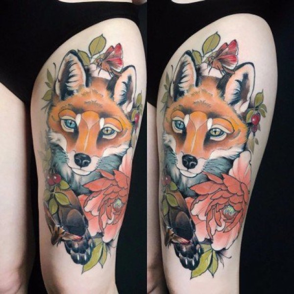 小动物纹身 女生大腿上花朵和狐狸纹身图片