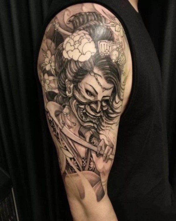 日本艺妓纹身图 黑灰或彩绘的日本艺妓包臂纹身图案
